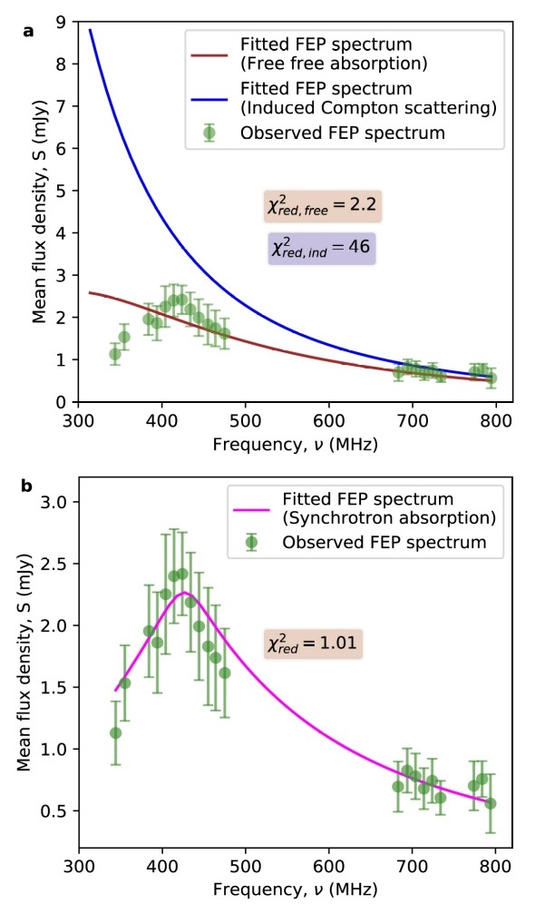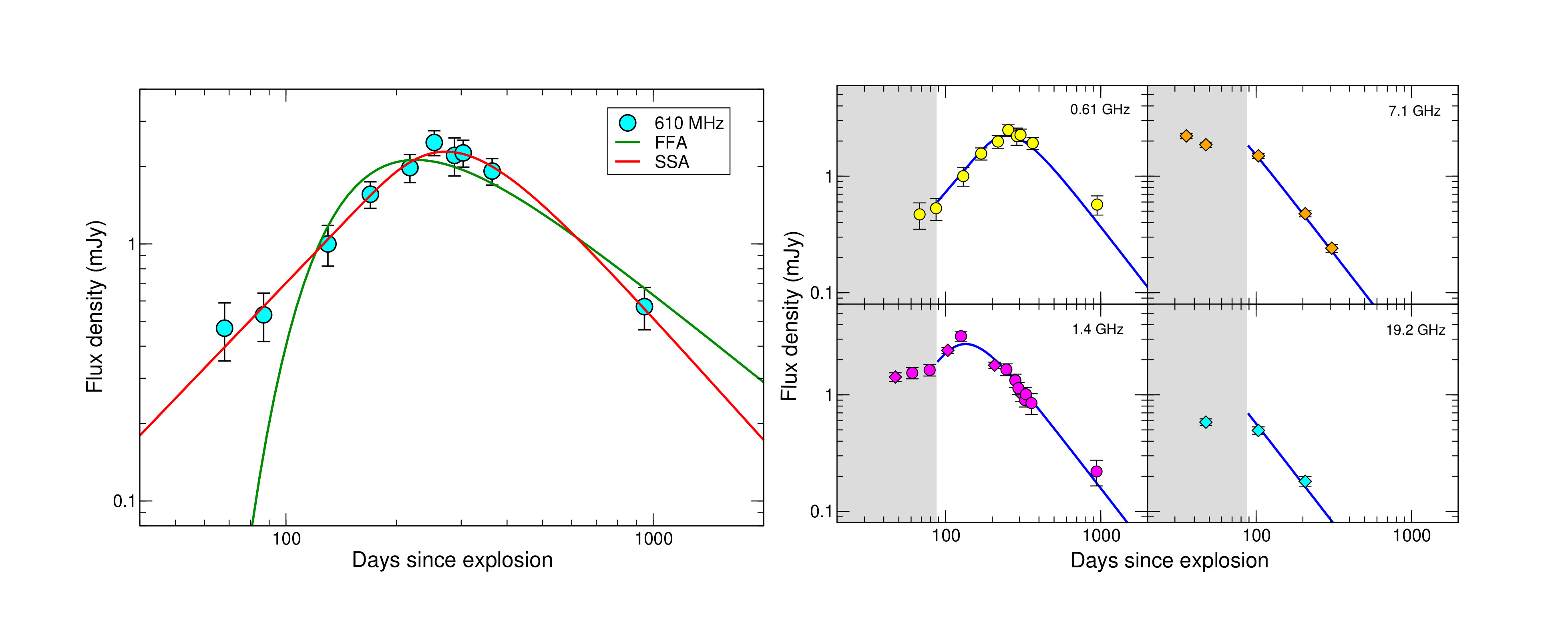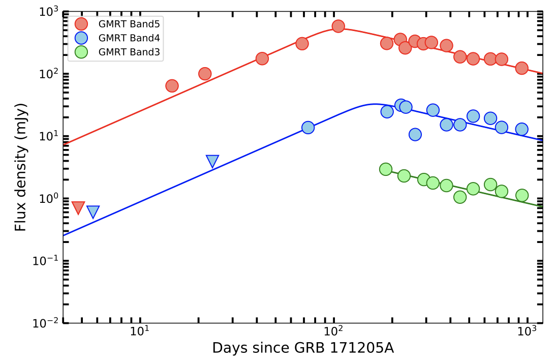 Radio emission from supernovae is considered to be synchrotron emission which is absorbed at early epochs. Since the absorption optical depth scales approximately proportional to the square of the wavelength, low frequencies are ideal to probe the optically thick phase. Chandra et al. used low-frequency Giant Metrewave Radio Telescope (GMRT) observations of a core-collapse (Type Ib) supernova, Master OT J120451.50+265946.6, to find that the radio-emitting shock is inhomogeneous, with the inhomogeneities confined within the magnetic field distribution. Because of these inhomogeneities, the absorption is due to the superposition of various optical depths caused by varying magnetic fields. The inhomogeneities are primarily visible at low frequencies, and the high-cadence, high-sensitivity GMRT observations were critical in unraveling the nature of the inhomogeneities, which has important implications for the size of radio emitting regions. The left panel of the figure shows a single-component synchrotron self-absorption model fit to the GMRT 610 MHz data on the supernova, in the optically thick phase; this reveals a very steep electron energy spectrum, which is highly unphysical. The right panel of the figure shows the best-fit model that incorporates inhomogeneous synchrotron self-absorption, again fitting to the supernova light curves. The data at 0.61 GHz and 1.4 GHz data are from the GMRT (with three 1.4 GHz data points from the Karl G. Jansky Very large Array (VLA)), while the 7.1 GHz and 19.1 GHz data are from the VLA. The data before day 87 have been excluded from the fit as the radio emitting shock was crossing a dense shell at this epoch.