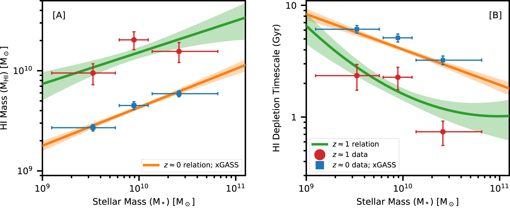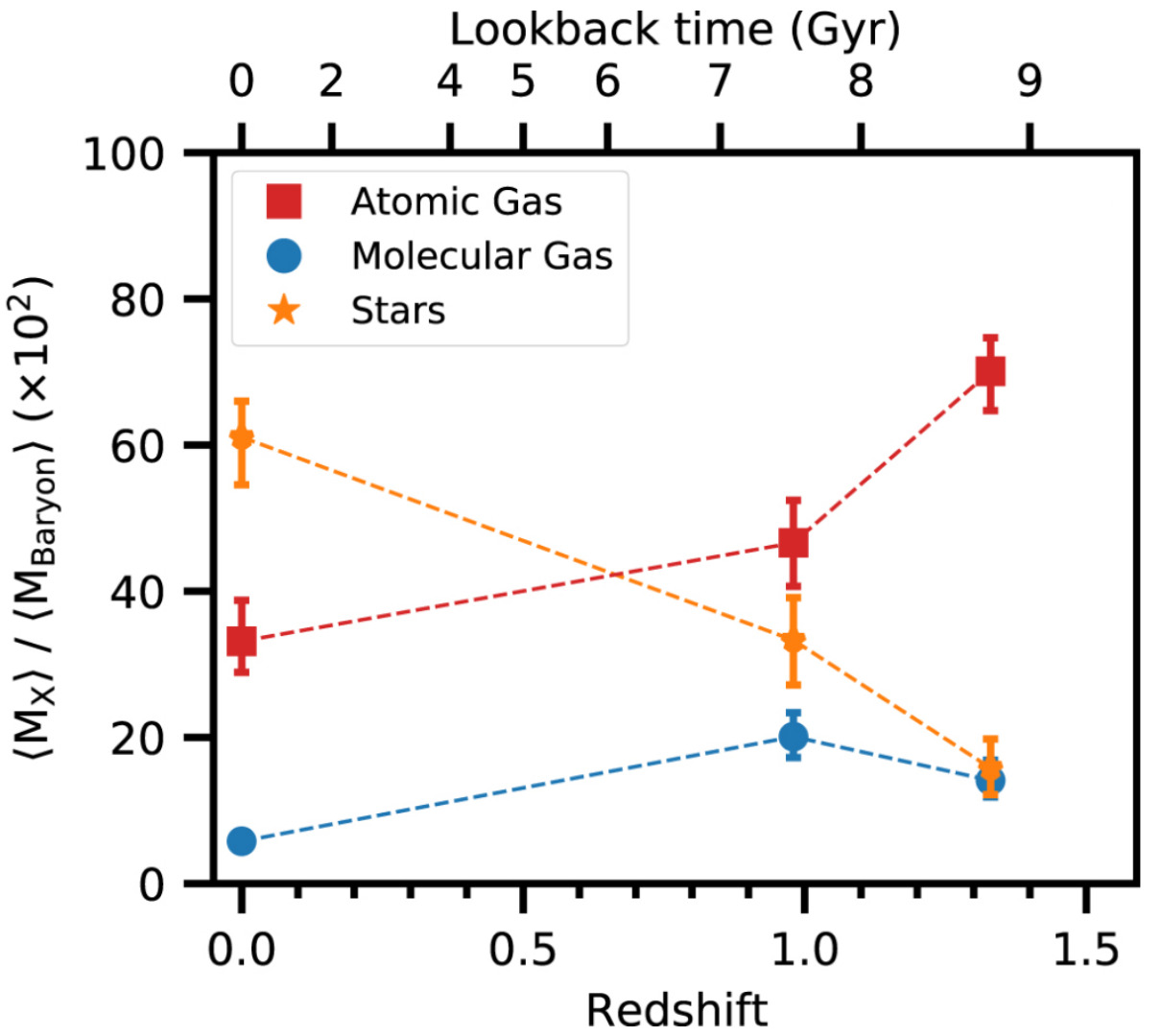 Baryonic processes in galaxy evolution include the infall of gas onto galaxies to form neutral atomic hydrogen (HI), which is then converted to the molecular state (H2), and, finally, the conversion of H2 to stars. Understanding galaxy evolution thus requires an understanding of the evolution of stars and of neutral atomic and molecular hydrogen. For the stars, the cosmic star-formation rate density is known to peak at redshifts between 1 and 3, and to decline by an order of magnitude over the subsequent 8 billion years; the causes of this decline are not known. For the gas, the weakness of the hyperfine transition of HI at 21 cm wavelength — the main tracer of the HI content of galaxies—means that it has not hitherto been possible to measure the atomic gas mass of galaxies at redshifts higher than about 0.4; this is a critical gap in our understanding of galaxy evolution. Chowdhury et. al. report a measurement of the average HI mass of star-forming galaxies at a redshift of about one, obtained by stacking the HI 21 cm emission signals from 7,653 galaxies over a 1.2 square degree region of the sky. The figure shows [A] the stacked HI 21 cm emission map and [B] the stacked HI 21 cm emission spectrum; the detection of the average 21cm emission signal can be clearly seen in both panels. The measured average HI mass of the sample of galaxies at z~1 is similar to the average stellar mass of the sample but the HI mass can fuel the observed star-formation rates for only 1 to 2 billion years in the absence of fresh gas infall. This suggests that gas accretion onto galaxies at redshifts of less than one may have been insufficient to sustain high star-formation rates in star-forming galaxies. This is likely to be the cause of the decline in the cosmic star-formation rate density at redshifts below one.