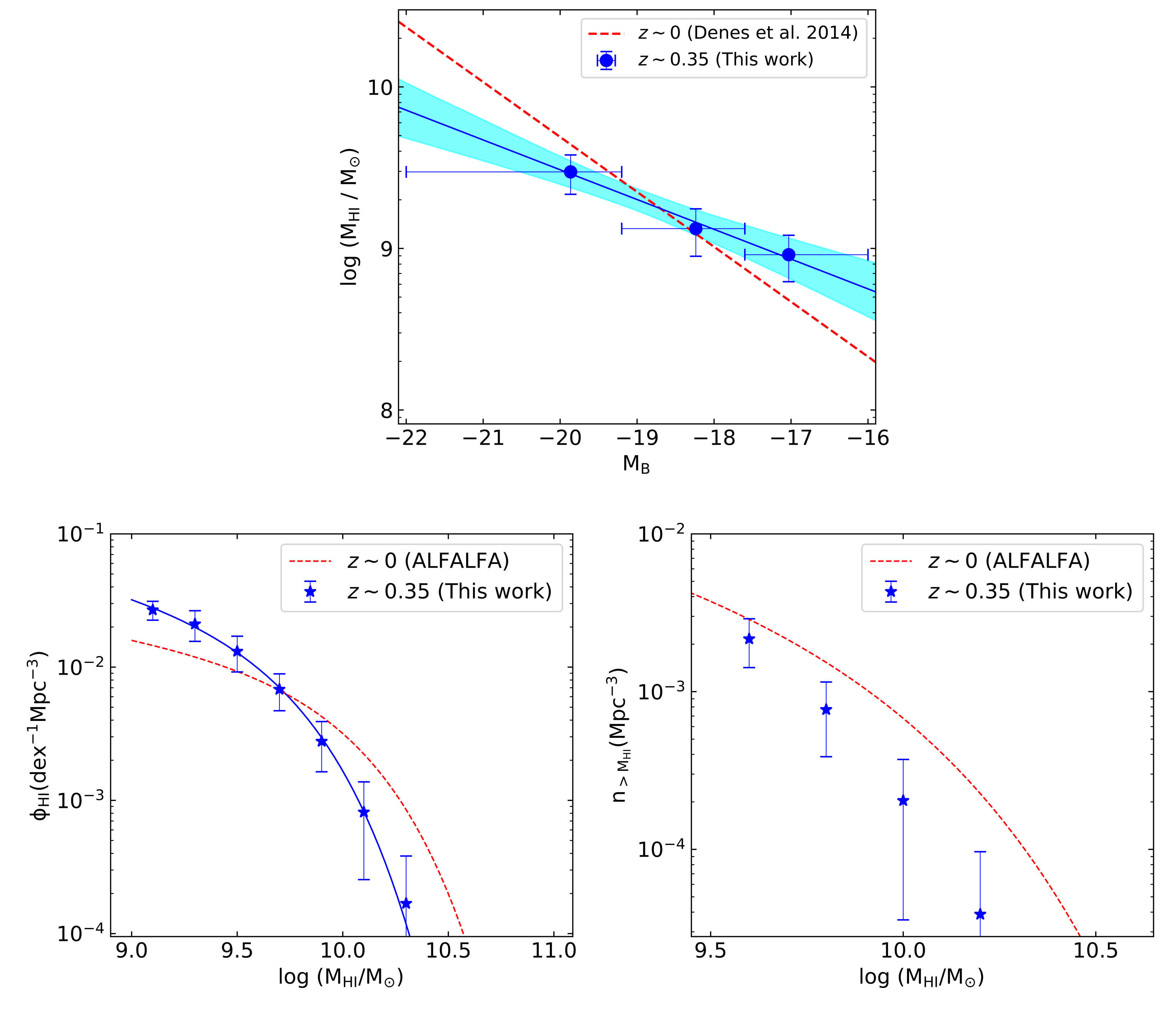 Bera et al. used the upgraded Giant Metrewave Radio Telescope to carry out a deep observation of one of the well-known optical deep fields, the Extended Groth Strip, (EGS) covering the frequency range 1000-1370 MHz. This enabled a sensitive search for the hyperfine HI 21cm line from neutral atomic hydrogen (HI) in galaxies in the EGS, in the redshift range z~0.05-0.4. Bera et al. stacked (i.e. averaged) the HI 21cm emission signals from 445 blue star-forming galaxies in the EGS at 0.2<z<0.4 to infer their average HI gas mass, obtaining an average HI mass of (4.93 +/- 0.70) × 10^9 solar masses at a mean redshift of <z>=0.34. This implies a ratio of average gas mass to average stellar mass of ~1.2 for star-forming galaxies at these redshifts, higher than the corresponding value in the local Universe. The author also stacked the rest-frame 1.4 GHz radio continuum emission of the same galaxies, and then used a relation between the 1.4 GHz radio luminosity and the star formation rate (SFR) to obtain a median SFR of (0.54 +/- 0.06) solar masses per year for the galaxies of the sample. If the galaxies continue to form stars at the same rate, their average HI content would be exhausted on a timescale of ~9 Gyr, consistent with values in star-forming galaxies in the local Universe. This suggests that the star-formation efficiency in blue star-forming galaxies has not changed significantly over the last ~4 Gyr. Finally, Bera et al. used the stacked HI 21 cm emission signal to infer the cosmic HI mass density in star-forming galaxies at z=0.2-0.4, obtaining a normalized cosmic HI density of (4.81 +/- 0.75) x 10^−4 at <z>=0.34. This is the first accurate measurement of the cosmic HI density at intermediate redshifts z~0.2-1.8, and indicates no significant evolution in the cosmic HI density from z~0.4 to the present epoch. The top panel of the figure shows the average HI 21cm emission profile of the 445 blue star-forming galaxies whose spectra were stacked together. The bottom panel shows the evolution of cosmic HI density from z~5 to today, with the blue star showing the measurement from the present study.