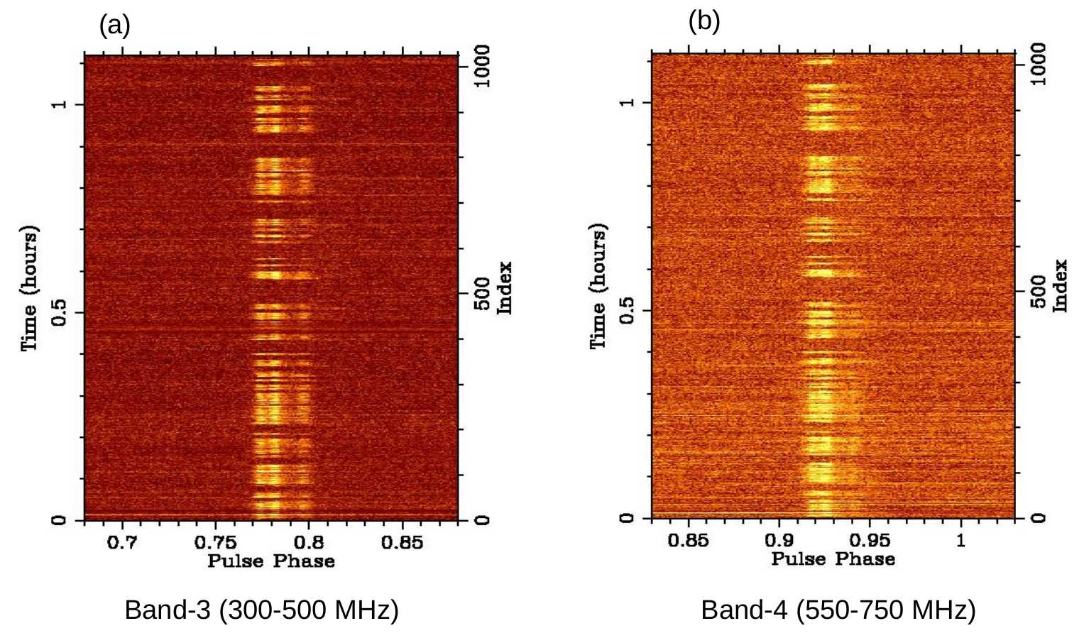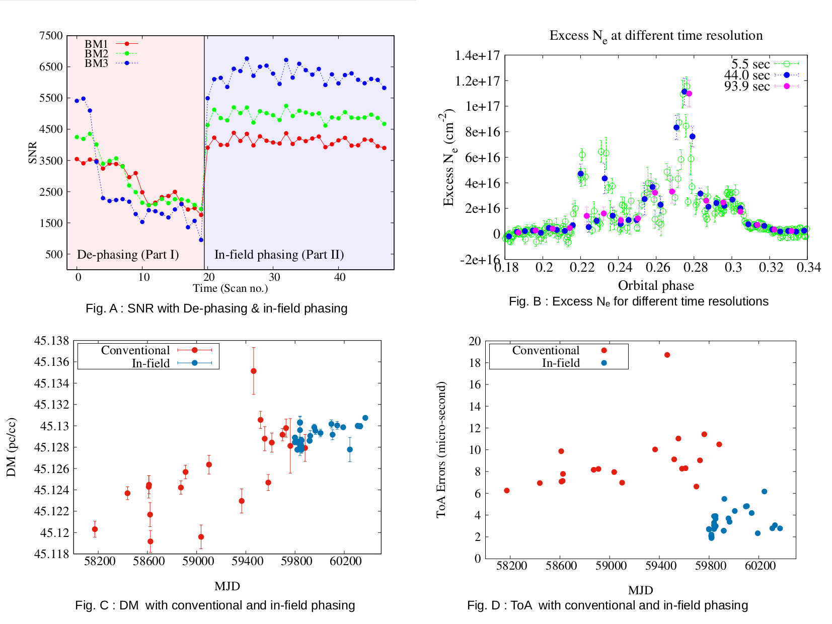 In time-domain radio astronomy with arrays, voltages from individual antennas are added in phase to form a beam, correcting for the ionospheric and instrumental gains. Conventionally, this is done using regular observations of a calibrator source located close to the target. This approach restricts the number of antennas that can be used to form the beam because the signals from more distant antennas tend to decorrelate due to ionospheric phase drifts. Also, this scheme is sub-optimal since it does not correct for the variation of the gains with time and position on the sky, but assumes that the gains are the same on the target source and on the calibrator. In order to mitigate these limitations, Kudale et al. (2024) presented a new methodology (called ``in-field phasing''), in which the gains on the target source are obtained in real-time, using a model of the sky intensity distribution in the target field. The authors tested the efficacy of in-field phasing via observations of the pulsar B0740-28, simultaneously recording data from three separate phased-array beams (referred to as beam-1, beam-2, and beam-3) with an increasing number of antennas. For the observations shown in Fig A. Part I, the array was phased (using in-field phasing) only once at the start of the observation, while, for the observations of Part II, the array phases were updated every 4 minutes. It is clear that, without in-field phasing, the signal-to-noise ratio (SNR) degrades rapidly, particularly for beam-3, which includes the most-distant antennas. Conversely, with in-field phasing, the SNR is approximately constant, as expected. The authors also demonstrated that in-field phasing significantly improves the sensitivity of upgraded GMRT pulsar observations. With in-field phasing observations of a GMRT-discovered pulsar J1544+4937, one can probe the eclipse region in much more detail by measuring the excess electron density (N_e) at a range of time resolutions, which reveals the possible clumpy nature of eclipsing material around the binary companion (as shown in Fig. B). The authors achieved approximately 3 times better dispersion measure (DM; see Fig. C) and time-of-arrival (ToA; see Fig. D) precision with in-field phasing compared to conventional phasing.