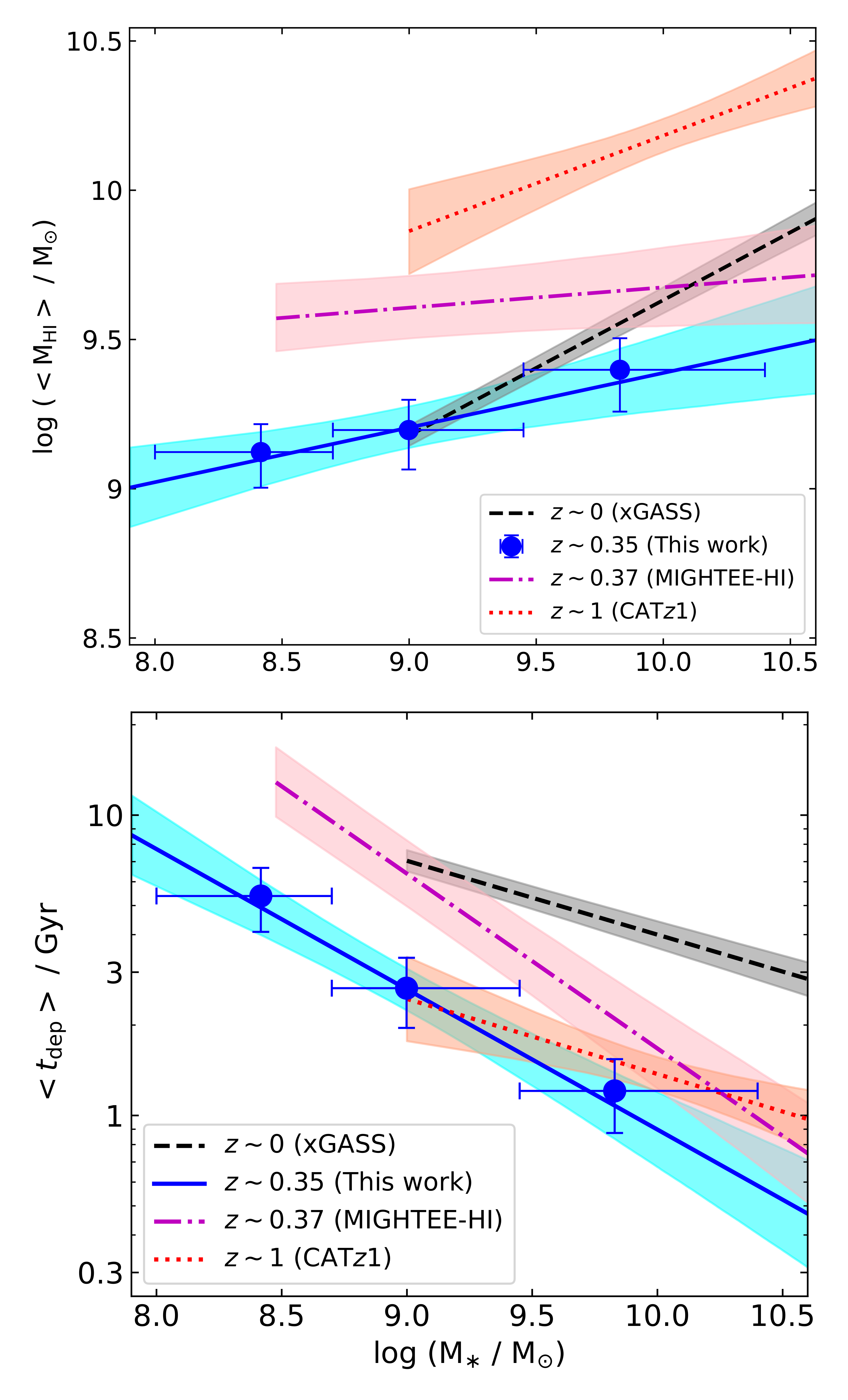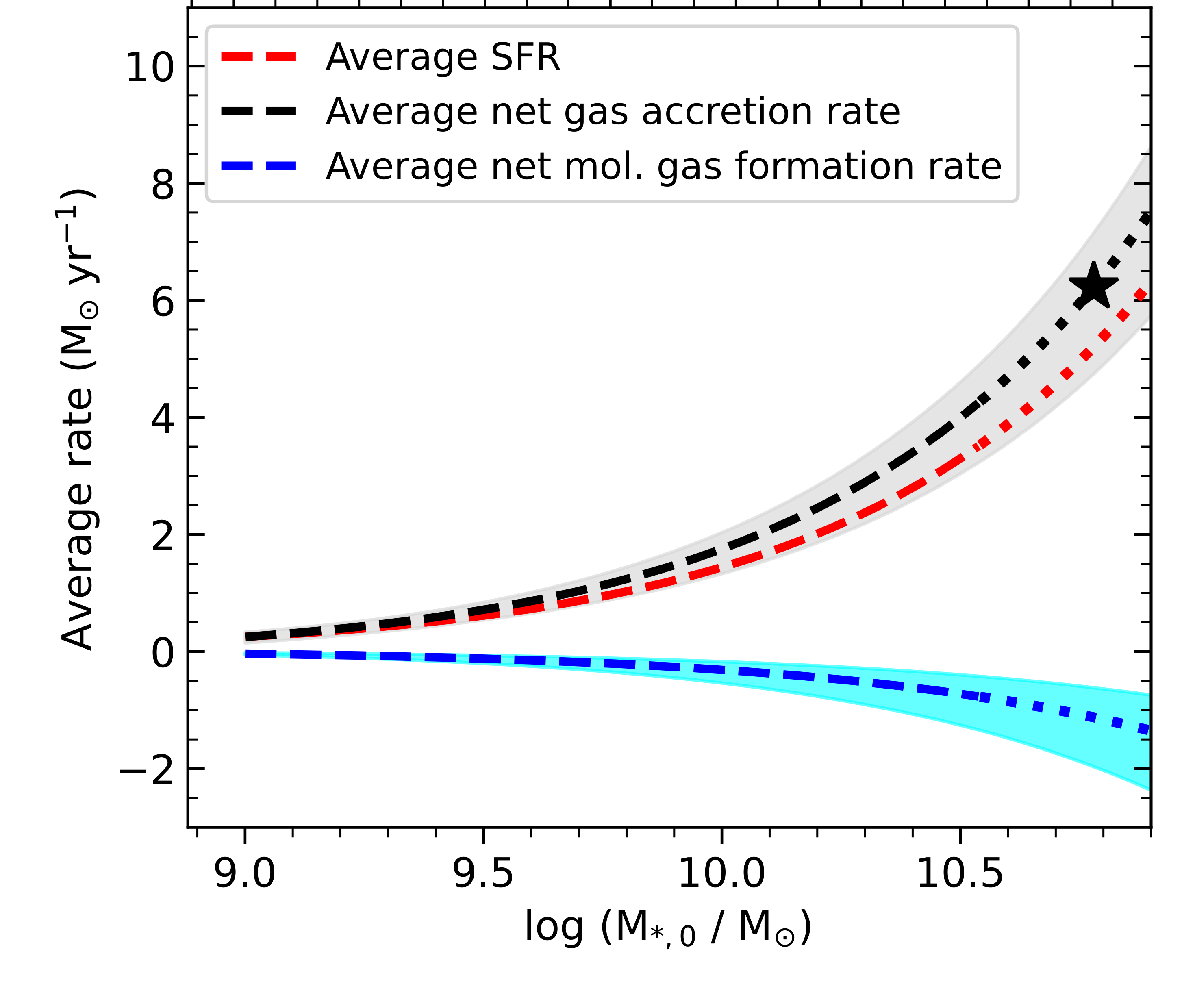A galaxy’s evolution is driven by processes that regulate its key baryonic constituents, the neutral atomic gas (HI), the molecular gas (H2), and the stars. These processes can be quantified by three key rates: (i) the net rate of accretion of HI from the circumgalactic medium (CGM) that surrounds the disk of the galaxy, (ii) the formation rate of H2 from HI, and (iii) the star-formation rate (SFR). While the evolution of the SFR density of the Universe with cosmological time has been known for over two decades now, the difficulty of measuring the HI content in distant galaxies has meant that there is so far no estimate of the gas accretion rate or its evolution at z~1. Chowdhury et al. used their recent measurement of the HI content of galaxies at z~1 (8 Gyr ago) from the GMRT- CATz1 survey to estimate the average rates of accretion of HI onto galaxies at two key epochs in galaxy evolution: (i) z ~ 1.3–1.0 (9 to 8 Gyr ago), toward the end of the epoch of peak star formation activity in the Universe, and (ii) z ~ 1–0 (8 Gyr to today), when the star formation activity of the Universe declines by an order of magnitude. The figure shows, for galaxies at the earlier epoch (z~1.3–1.0), as a function of their stellar masses, the time-averaged net gas accretion rate (in green), the H2 formation rate (in orange), and the average star-formation rate (in blue). The figure demonstrates that, for galaxies at the early epoch, between 8 to 9 Gyr ago, the average gas accretion rate is far lower than the average SFR, but the H2 formation rate is comparable to the average SFR. Conversely, the authors find that, at later times (8 Gyr ago to today, not shown in the figure), both the accretion rate and the H2 formation rate are significantly lower than the average SFR. Chowdhury et al. also show that massive galaxies had already acquired most of their present-day baryonic mass 9 Gyr ago. Overall, the results show that the rapid conversion of the existing atomic gas reservoir to molecular gas was sufficient to maintain a high average SFR in galaxies 8-9 Gyr ago, despite the low net gas accretion rate. However, at later times, the combination of the lower net gas accretion rate and the lower H2 formation rate leads to a decline in the fuel available for star formation and results in the observed decrease in the SFR density of the Universe over the last 8 Gyr.