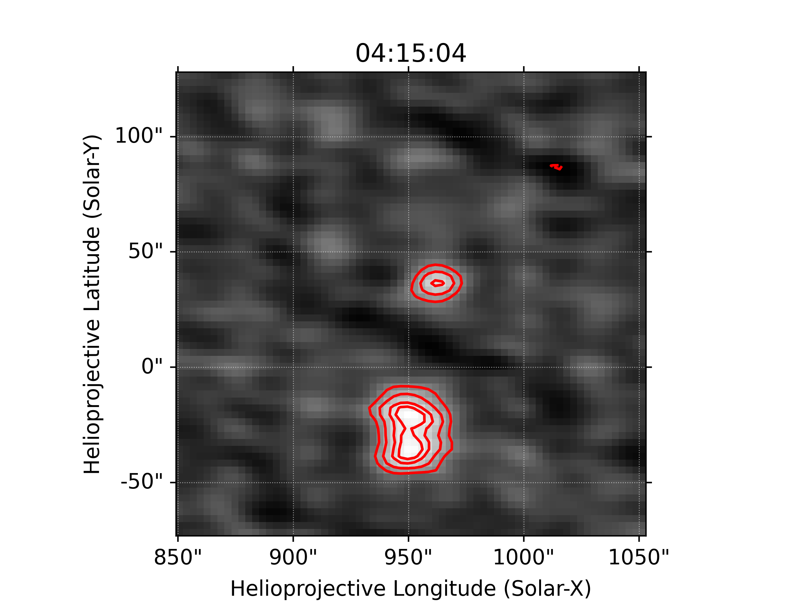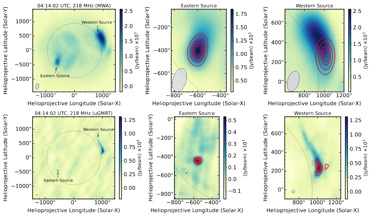 Among the most commonly observed solar radio sources in the metric and decametric wavelengths are the solar noise storms. Powered by a plasma emission mechanism, noise storm sources can become significantly scatter-broadened due to the multi-path propagation caused by refraction from the coronal density inhomogeneities. Scatter-broadening imposes a fundamental limit on the minimum observable source size in the solar corona. While past observational and theoretical works have tried to estimate this limiting size, the limit depends on the details of the coronal turbulence model. As such, pushing the minimum observable source size to smaller values can help constrain the plasma environment of the observed sources as well as the models of coronal turbulence. In this work, Mondal et al. (2025) use data from the upgraded Giant Metrewave Radio Telescope in the 300-500 MHz band to determine, for the first time, multiple instances of structures with length scale of approximately 20" in noise storms. These sources are much smaller than structures reported earlier in the corona at similar frequencies. These small sources are stable over timescales of 15-30 minutes and are detected over the entire available bandwidth of about 200 MHz. The adjacent figure shows an example of a noise storm source, in the magenta contours. The radio image was generated by integrating 24 MHz and 25 minutes of data. The size of the source was estimated by fitting the region bounded by the yellow dashed circle by a Gaussian, and found to be 30" x 16". Such small source sizes are very hard to explain using the currently prevalent coronal turbulence models. To understand the origin of such small sources, Mondal et al. also build an illustrative model. They demonstrate that it is easier to account for the existence of such small sources if they originate in coronal loops, which are much denser than the background coronal plasma.