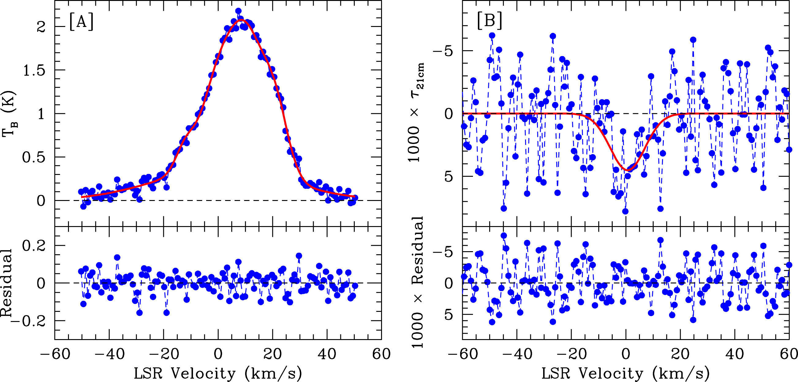 HI 21cm absorption arising from neutral hydrogen in the environments of Active Galactic Nuclei (AGNs) can be used to probe physical conditions in the AGN’s vicinity and how these conditions change over time. However, despite a large number of searches spanning many decades, only 7 such ``associated'' HI 21cm absorbers have been detected at redshifts greater than one. Chowdhury et al. used the new wide-band GMRT Band-4 receivers to discover two remarkable HI 21cm absorbers at a high redshift, z~1.2, against faint AGNs. The two absorbers were found in an unbiased search for HI 21cm absorption against all radio-continuum sources over a 1.2 square degree region of the sky, the first time that such a search has been carried out with a high sensitivity at high redshifts. The velocity-integrated HI 21cm optical depths of the two systems, shown in the figure, are greater than those of any known associated HI 21cm absorbers, and the two AGNs are very faint in both the radio and the ultraviolet wavebands. The discovery of these two systems is consistent with an earlier hypothesis that the dearth of associated HI 21cm absorbers at high redshifts, z>1, may be due to an observational bias wherein high-redshift AGNs targeted in surveys for associated HI 21cm absorbers are bright in the ultraviolet and radio wavelengths. The high AGN radio and/or ultraviolet luminosity may ionize or excite the HI in its vicinity, reducing the strength of the HI 21cm absorption. The two new HI 21cm absorbers emphasize the need to carry out unbiased HI 21cm absorption surveys and to extend future searches to low luminosity AGNs.
