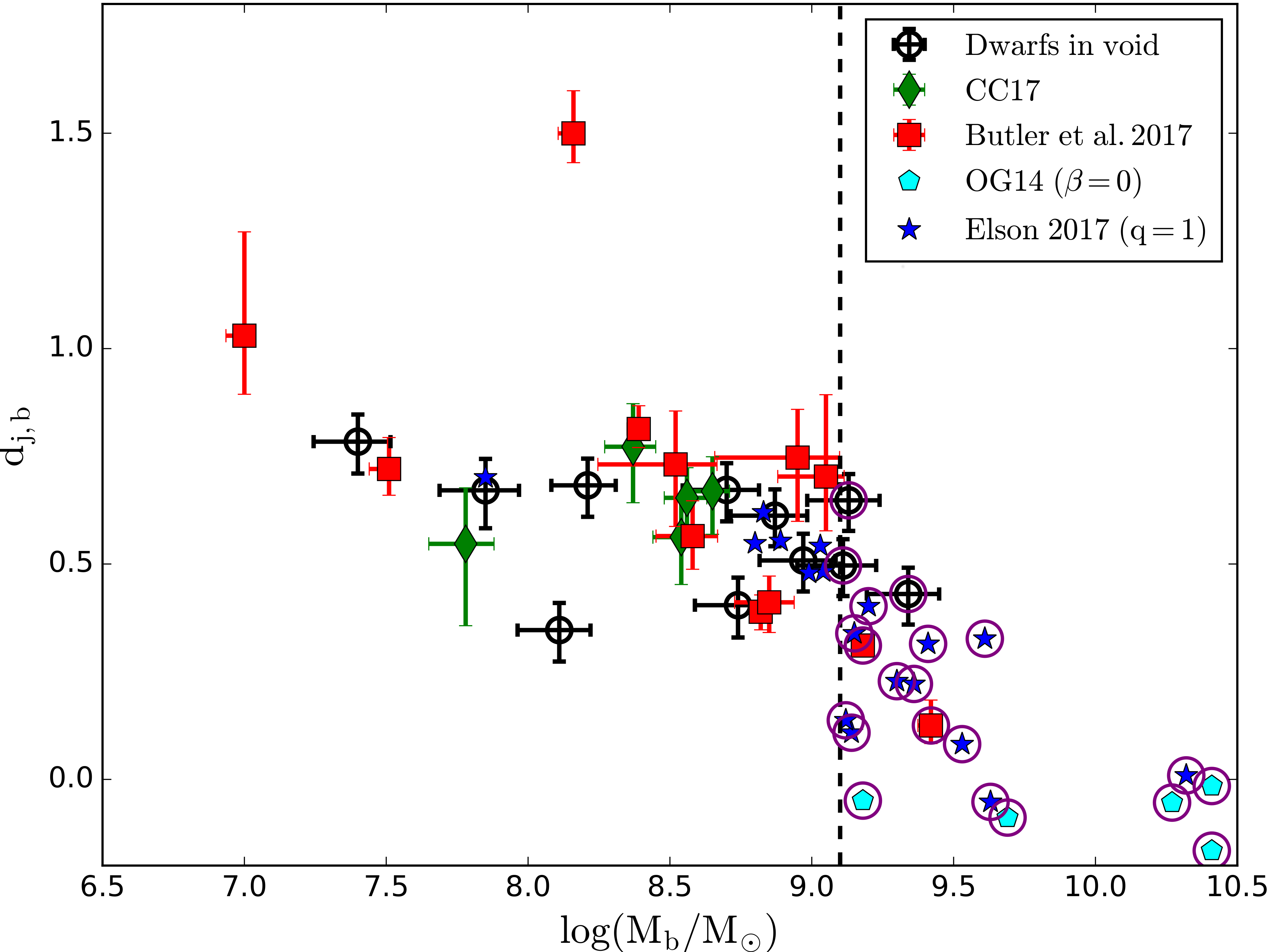 Mass and specific angular momentum are two fundamental physical parameters of galaxies. Kurapati et al. (2018) use high-resolution HI 21cm observations and broad band photometry to measure the baryonic mass (M) and baryonic specific angular momentum (j) of 11 dwarf galaxies that lie in the Lynx-Cancer void. They find that the specific angular momentum of void dwarf galaxies is similar to that of other dwarf galaxies in average density environments. However, all dwarf galaxies (regardless of environment) have significantly higher specific angular momentum than expected from an extrapolation of the relation between specific angular momentum and baryonic mass for large spiral galaxies. The figure shows the difference between the observed specific angular momentum of dwarf galaxies and the specific angular momentum expected from the bulge-less spiral relation, as a function of baryonic mass. The elevation in specific angular momentum occurs for dwarf galaxies with masses lower than roughly a billion solar masses. Galaxies above this mass threshold have relatively low baryonic specific angular momenta, following the relation obtained for massive galaxies with zero bulge fraction. Interestingly, the above mass threshold is very similar to the mass below which galaxy discs start to become systematically thick. Kurapati et al. examine the possibility that both these effects, viz. the thickening of disks and the increase in specific angular momentum, are results of feedback from star formation. Such feedback would preferentially remove the low angular momentum gas from the central parts of dwarfs (thus increasing the specific angular momentum of the system) and also inject mechanical energy into the system, leading to thicker discs. They find however, that the observed amount of observed star formation in their sample galaxies is insufficient to produce the observed increase in the specific angular momentum. It hence appears that some other, as yet unknown mechanism, plays a role in producing the observed enhancement in specific angular momentum.