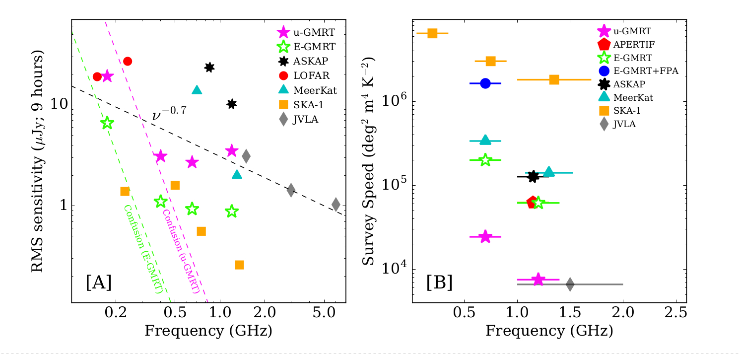 In the figure, the left panel shows the root-mean-square (RMS) continuum noise of the EGMRT compared with that of modern radio interferometers (the uGMRT, the JVLA, LOFAR, MeerKAT, ASKAP, and the SKA-1) for a 9-hour full-synthesis integration. The green and magenta dashed lines show the RMS confusion noise for, respectively, the EGMRT and the uGMRT, at the different observing frequencies. It is clear that source confusion will be a limiting factor for the EGMRT only in its lowest frequency band (125-250 MHz), where the sensitivity is likely to anyway be limited by systematic effects, rather than thermal noise. The right panel shows the survey speed figure of merit (e.g. Dewdney et al. 2015), of the EGMRT compared with that of other present or planned radio interferometers. For the EGMRT, we have considered two possibilities: the open green stars (EGMRT) refer to single-pixel feeds on all 86 antennas, while the solid blue circles (EGMRT+FPA) assume FPAs covering 550-850 MHz installed on the 45 antennas within ~ 2.5 km of the central square.