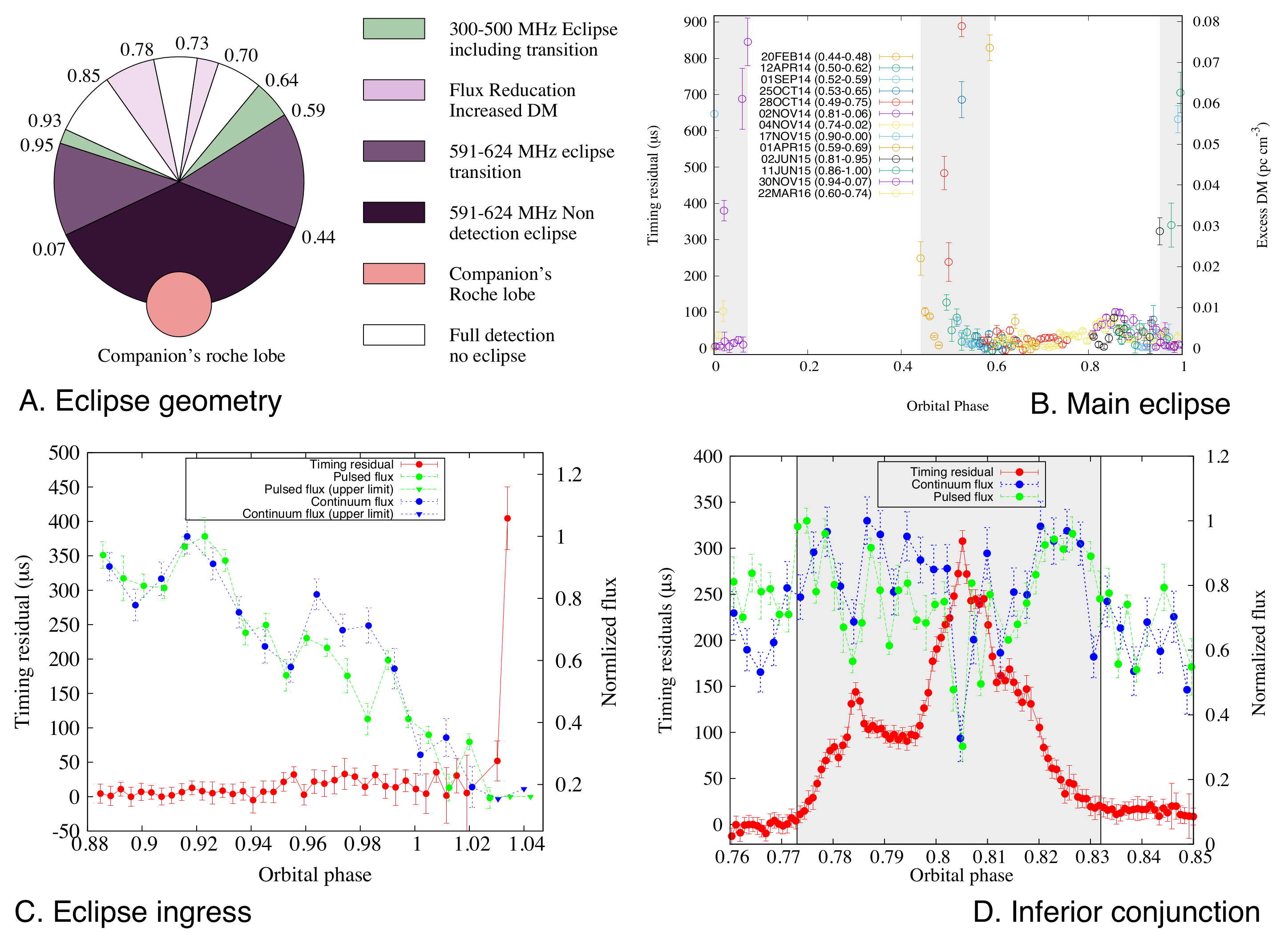 Kudale et al. present a multifrequency study of eclipse properties of a transitional redback millisecond pulsar J1227-4853 discovered with the GMRT. Emission from this pulsar is eclipsed at 607 MHz for about 37% of its orbit (shown in panel-B) around the superior conjunction. The authors observed eclipse ingress and egress transitions (identified by excess dispersive delays up to 0.079(3) pc cm^-3) that last for 12% and 15% of the pulsar orbit, respectively, resulting in only 36% of the orbit being unaffected by eclipsing material. Simultaneous dual-frequency GMRT observations (300-500 MHz and 550-750 MHz) allowed a probe of the frequency-dependent eclipse geometry (shown in panel-A) with a power-law index for the frequency dependent eclipse duration as n = -0.44. The simultaneous timing and imaging studies (shown in panel C & D) suggest that the eclipses in J1227-4853 are not caused by temporal smearing due to excess dispersion and scattering, but could be caused by removal of pulsar flux due to cyclotron absorption of the pulsed signal by intra-binary material; this can be used to constrain the magnetic field of the companion. In order to check if cyclotron-synchrotron absorption of pulsar emission by nonrelativistic or relativistic electrons is the cause of the eclipse, the authors estimated the magnetic field of the eclipsing plasma in the vicinity of the companion to be 27 G, and the cyclotron fundamental frequency to be 77 MHz. Observed eclipses reported in the paper for PSR J1227-4853 are centered at 322 and 607 MHz, which are the fourth and eighth harmonics of the above cyclotron fundamental frequency. For PSR J1227-4853, cyclotron absorption at the fundamental cyclotron frequency and its lower harmonics could be the cause of eclipse. Additionally, near the inferior conjunction at orbital phases 0.71 and 0.82 the pulsed emission is significantly delayed (corresponding to a DM change of 0.035(3) pc cm^-3), which is associated with a fading of the pulsed and continuum flux densities (shown in panel-A, by light purple color). The minima in continuum flux densities (up to ~30% of the peak flux density) around the inferior conjunction coincide with the maxima in excess dispersion (shown in panel-D). Such flux fading around a fixed orbital phase near the inferior conjunction is not reported for other eclipsing binaries. This event around the inferior conjunction could be caused by absorption of the pulsed signal by fragmented blobs of plasma generated from mass loss through the L2 Lagrangian point.