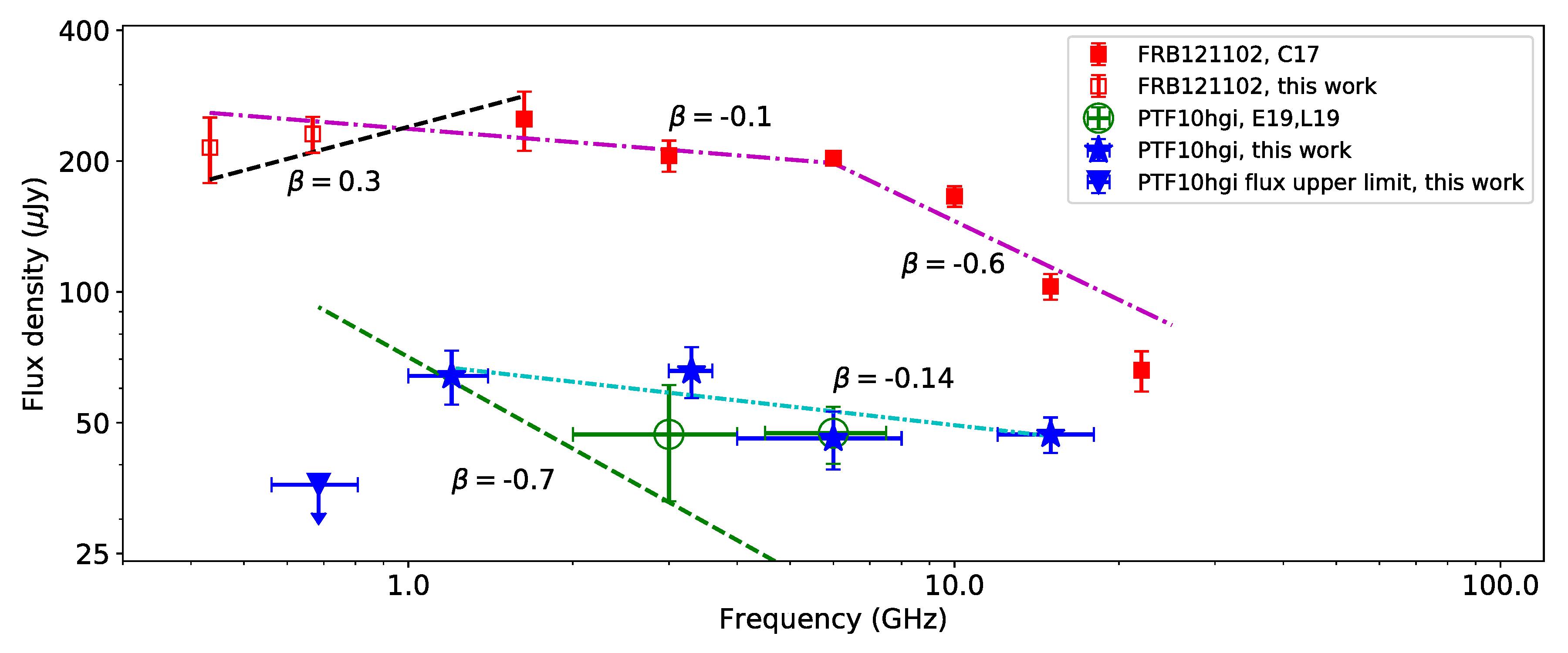 Superluminous supernovae (SLSNe) are a type of supernova that have an optical absolute magnitude <−21 and are more than 10 times brighter than typical supernovae. Of the SLSNe, the most mysterious ones are the Type I SLSNe, which do not show any hydrogen line in their optical spectra. Little observational evidence exists to test the various theories proposed to explain the high luminosity of these objects. Additionally, at least some of the Type I SLSNe are hypothesised to emit Fast Radio Bursts (FRBs). However, this association was made based on the properties of the host galaxy of a very well studied FRB, FRB121102 and the host galaxies of Type I SLSNe. Until the present work, there had been no quantitative study of the relationship between the radio emission from a Type I SLSN and that from an FRB. Mondal et al. observed the first radio-detected Type I SLSN, PTF10hgi, over a wide frequency range spanning 0.6-18 GHz using the upgraded Giant Metrewave Radio Telescope (uGMRT) and the Karl G. Jansky Very Large Array (JVLA), and quantitatively estimated the various physical properties of the radio-emitting region. The spectral nature of the source was found to be very similar to that of the persistent radio source associated with FRB121102. Their analysis revealed that the radio emission of PTF10hgi originates from a magnetar wind nebula, confirming the hypothesis of Inserra et al. (2013). They also demonstrated that the nebula is powered by the rotational energy of the magnetar. Additionally, Mondal and collaborators analysed archival uGMRT data and extended the available spectrum of FRB121102 to 0.3 GHz. These new measurements put strong constraints on some of the models of FRB121102, ruling out some models. Wang et al. (2020) have already demonstrated that the persistent emission of FRB121102 might be powered by the same mechanism that powers the radio emission of SLSNe, demonstrating for the first time a relationship between a Type I SLSN and a FRB. Based on their calculations, Mondal et al. (2020) also hypothesised that if PTF10hgi is emitting FRBs, their energies will be much lower than that observed from FRB121102. The spectra of the two sources are shown in the adjoining image, where beta is the power-law index of the radio spectrum.