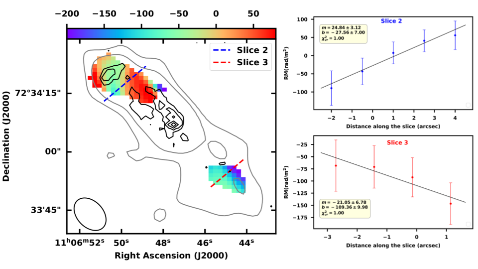 Seyferts are a class of active galactic nuclei (AGNs) found in spiral or lenticular galaxies, characterised by a bright, compact nucleus featuring high-ionisation emission lines in their optical/UV spectra. These AGNs are traditionally thought to lack strong jet outflows and are thus faint in radio synchrotron emission. Ghosh et al. present multi-frequency radio-polarimetric observations of NGC3516, a Seyfert galaxy and changing-look AGN, using the Karl G. Jansky Very Large Array (VLA) at 5.5 and 10 GHz, and the Giant Metrewave Radio Telescope at 663 MHz, and revealing the importance of the magnetic field in shaping even weak radio jets. NGC3516 shows polarised radio continuum emission, indicating the presence of both poloidal and toroidal magnetic fields. For the first time, the authors detected transverse gradients in the rotation measure (RM, the ratio of the difference between the intrinsic and observed polarisation angles to the square of the wavelength) across the kiloparsec-scale lobes in a radio-quiet Seyfert outflow. This indicates an ordered helical magnetic field, sustained out to kiloparsec scales. The RM gradients are oriented in opposite directions in the northern and southern lobes relative to the core, consistent with a helical magnetic field being wound by the same central engine, but viewed on opposite sides. The left panel of the figure shows the RM of NGC3516, along with the transverse slices taken along the northern (blue) and southern (red) lobes; VLA 5.5 GHz (black) and 10 GHz (grey) contours of the source at >3 sigma are overplotted. The right panel shows gradients fitted using the chi-square minimisation technique. Additionally, the authors report the first-ever detection of circular polarisation in both the core and inner jet knot in a Seyfert galaxy, confirming the presence of complex magnetic field configurations in even a radio-quiet system.