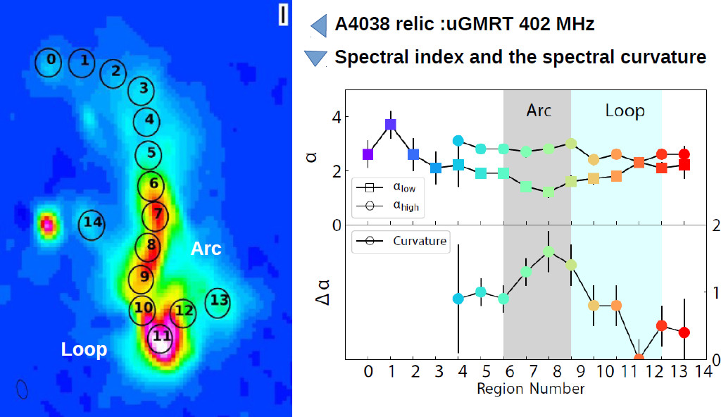 The origin of cosmic rays in the intra-cluster medium (ICM) has been attributed to re-acceleration of charged particles in shocks and turbulence. For these re-acceleration mechanisms to work, it is expected that there will be reservoirs of seed cosmic ray electrons in the ICM. Radio galaxies with jets and lobes are strong candidates for providing these seeds. Dr. Kale and collaborators have used the unique broad band observing capabilities of the recently operational upgraded Giant Metrewave Radio Telescope (uGMRT) to study an enigmatic "dead radio galaxy" or a "remnant radio relic" in the galaxy cluster Abell 4038. They have shown that the spectrum of the source varies considerably across its extent and undergoes extreme changes from high to low frequencies that are quantified in a parameter called the "spectral curvature". The authors fine that the assumption that the spectra of seed particles are simple power-laws may not be correct, given the extreme spectral curvature measured using the uGMRT images. Their study has recently been accepted for publication in the Monthly Notices of the Royal Astronomical Society.